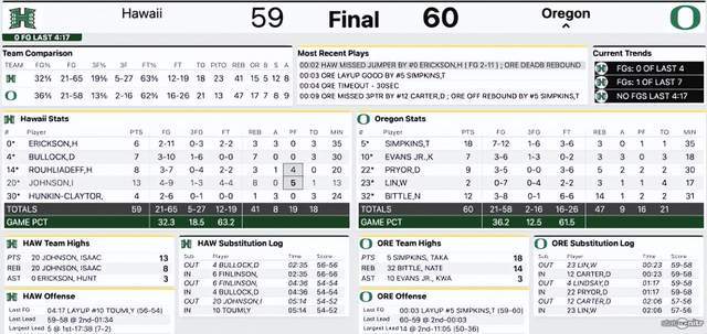 林葳之前在联赛开始前,已经有过上场了,当时打得还不错,被外界寄予厚望。本以为到了正赛开始之后,林葳可以展现该有的霸气。 11月5日,俄勒冈大学与夏威夷大学迎来了新赛季的第一场比赛。林葳还是很受信任的,直接获得首发。 比赛上来,林葳通过突破造成对手犯规,用罚球开启NCAA第一分,开局他已经贡献2分1助攻,不过球队失误有点多,一度落后夏威夷大学。好在对手给力,又给追了回来,半场以31-25领先。