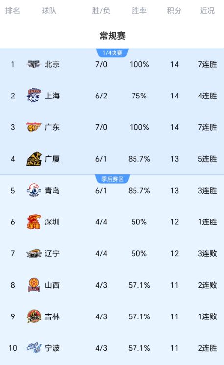 最新积分榜排名,深圳队反超辽宁队,升至第六位。 |