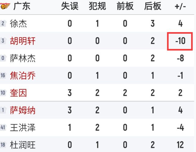 赛后评分: 依旧很难评,按广东队的阵容本可以不用打的这么艰难的,只能说这一场又有人拖后腿了,首当其冲的正是胡明轩,上半场0分,下半场仅得3分,其次是张皓嘉和王洪泽,张皓嘉本场仅得3分对位防不住贺希宁、史密斯,王洪泽只有1分1板,完全被周鹏、王浩然碾压,撞到新秀墙了。