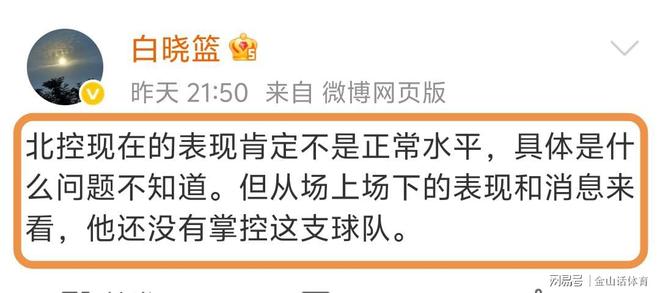 北控男篮士气低落,也让许多媒体人觉察到。赛后,媒体人白晓篮社媒发文点评本场比赛。配文:北控现在的表现肯定不是正常水平,具体是什么问题不知道。但从场上场下的表现和消息来看,他还没有掌控这支球队。