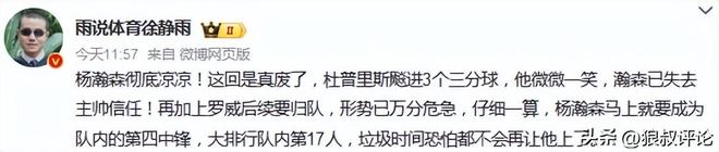 网红媒体人徐静雨直言表示:杨瀚森彻底凉凉!这回是真废了,杜普里斯飚进3个三分球,他微微一笑,瀚森已失去主帅信任!再加上罗威后续要归队,形势已万分危急,仔细一算,杨瀚森马上就要成为队内的第四中锋,大排行队内第17人,垃圾时间恐怕都不会再让他上了。