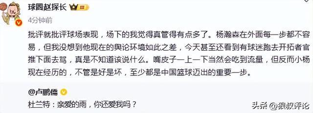 媒体人“卢鹏儒”则是发出了各大社媒当中,徐静雨对于杨瀚森输出动态,配文表示:“杜兰特:亲爱的雨,你还爱我吗?”。