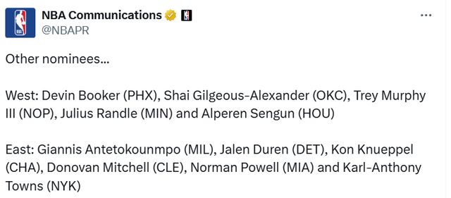 NBA官宣周最佳:约基奇坎宁安场均30+全胜当选申京字母获提名