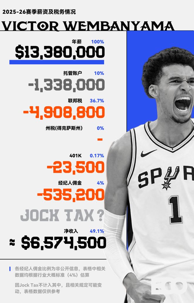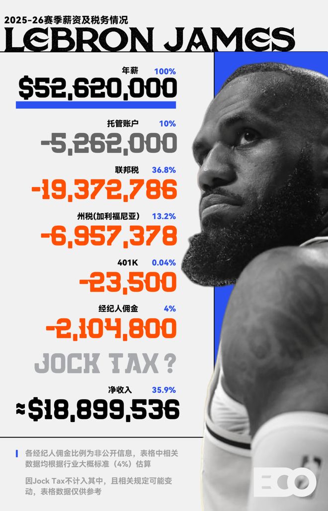 各队总经理会根据球队发展路线规划对于工资帽的使用 图源:Yahoo 以刚刚过去的2024-25赛季为例:去年赛季开始前,BRI被预估为102.5亿美元,按上文比例分成,并扣除约7亿的保险部分后,平均分到30支球队,就得出了去年的工资帽:1.405亿美元。 而因为劳资协议规定,每年的工资帽涨幅不能超过10%。因此,即便760亿的天价转播合同开始生效,BRI大幅上涨,今年的工资帽也只是上涨了10%,来到1.546亿美元。 对球员而言,工资帽决定了最多能拿到多少钱,但真正能装进口袋的收入,却远没有账面数字那么简单。当工资从联盟拨付到个人账户的那一刻起,一整套复杂的财富分配体系也随之启动,而其中的第一道,也是最大一道切口,来自税。