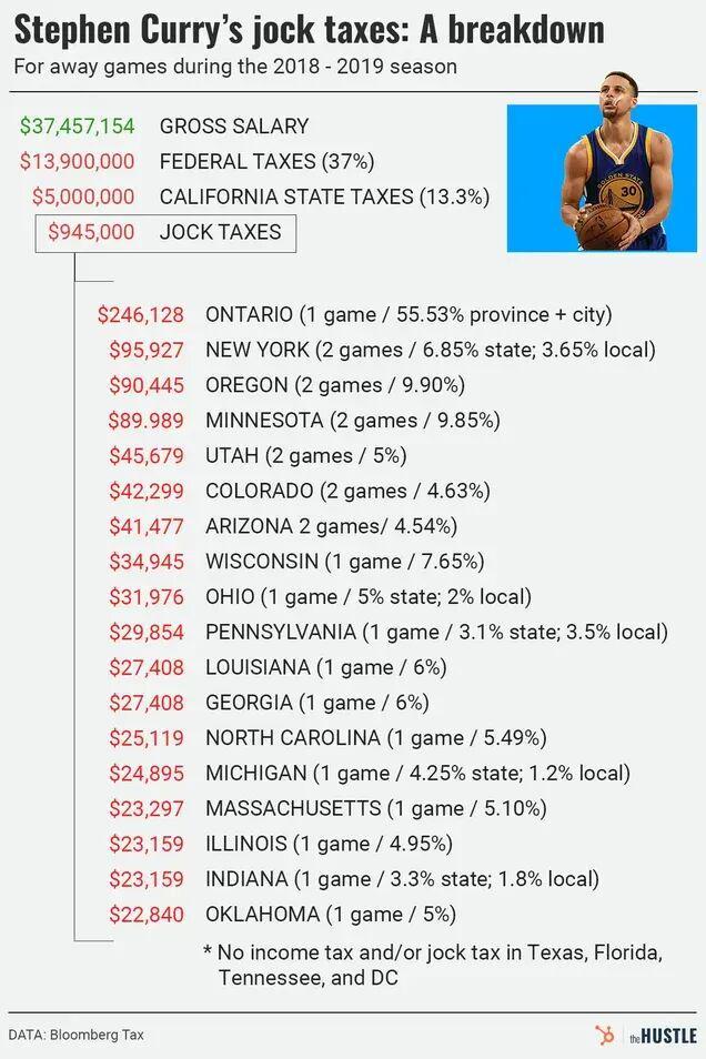 事实上,许多在高税州打球的球员会借助专业的报税机构,做合规的税务优化。 据美国知名会计顾问企业PKF O'Conner Davies合伙人约瑟夫·多伦介绍,许多球员会选择通过居住地申报、信托架构,以及延后发放等方式,以平滑年度税负。 问题来了,对于NBA球员来说,一年中有一半的时间都在客场作战,其中的许多经济效益并非来自已经交过税的母队所在地,那这个税怎么算? 1991年,公牛队在洛杉矶客场赢下总冠军后,加州税务局便提出了这样的疑问。相关人员当时认为公牛队在加州土地上为自己创造了巨大财富,但并没有向加州上缴任何税款,随即决定向迈克尔·乔丹与整个公牛队加征州税。 作为回击,公牛队所在的伊利诺伊州举一反三,宣布对所有来芝加哥打客场的球员征收州税,后来几年,各州纷纷效仿,最终形成了美国境内为体育、演艺行业量身定制的「Jock Tax」。 简单来说,每到一座不同的城市打客场,球员都就会被记上一笔「Jock Tax」,这意味着NBA球员在打完一个赛季后,必须要向十几个州分别申报、缴税。