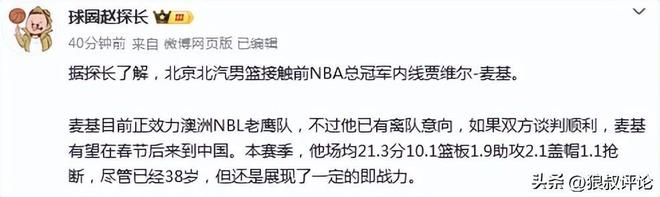 NBA总冠军内线!媒体:北京正在接触麦基谈判顺利将春节后来中国