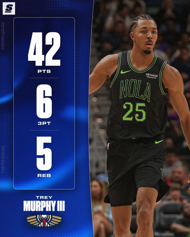 本赛季的墨菲各项数据都有极大提升,场均35.6分钟,拿到21.3分6.1篮板3.5助攻1.5抢断0.2盖帽,命中率49.5%,三分命中率38.2%,鹈鹕官方一直在为他拉全明星选票。