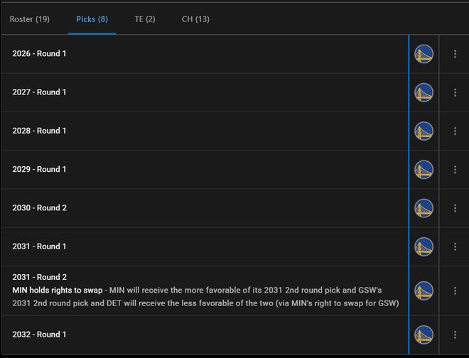 勇士手中只有26年、27年、28年、29年、31年、32年的首轮签,也就是没有30年,所以目前勇士能交易的首轮签只有三个,换墨菲要送两个后,直到2032年只有4个首轮签,勇士队会愿意吗? |