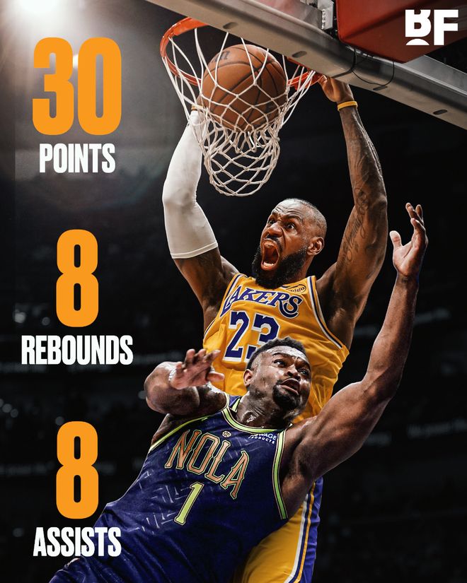 这场比赛后勒布朗又创造多项历史第一纪录: 1.詹姆斯的职业生涯总出场时间为59642分钟,NBA历史第一; 2.生涯574场30+继续刷新自己保持的历史第一纪录; 3.41岁后已经拿到两场30+历史第一; 4.41岁7天刷新个人保持的历史最年长30+纪录;
