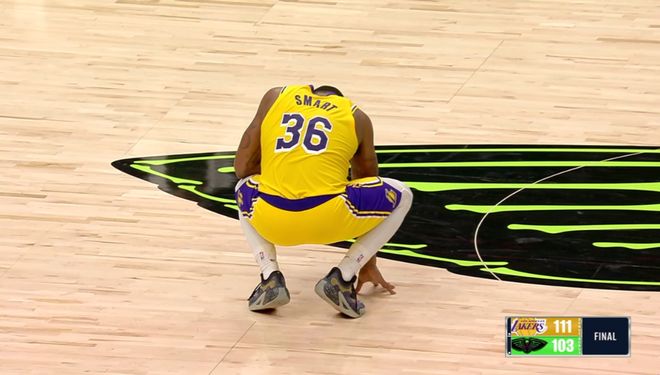 在今天与鹈鹕的比赛中,终场哨声响起后。 斯玛特因为上一回合的拼抢,痛苦的蹲在球场中央,并没有回到替补席。