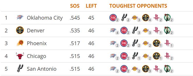 不过对雷霆队来说,好消息是他们依旧能创造出大量的空位三分机会。近12场比赛,他们场均出手24次大空位三分,位列联盟第三,但大空位三分命中率仅为34.4%,排名联盟第28位。只要他们能持续创造出这样的空位机会,命中率迟早会回弹。 但近年来的大量事实证明,若不引进更优质的射手,雷霆队的三分投射状态仍会持续大起大落。普雷斯蒂会在交易截止日前出手,补强球队的外线空间吗? 4.赛程难度陡增,密集征战考验体能 赛程难度的提升,是雷霆队战绩滑坡的另一个关键因素。 在24胜1负的梦幻开局阶段,他们仅与5支目前胜率超过50%的球队交手;而在近期6胜6负的低迷期,他们与6支胜率超50%的球队过招,其中4场遭遇失利。本赛季至今,雷霆队对阵胜率低于50%的球队时,战绩为24胜2负;对阵胜率高于50%的球队时,战绩仅为6胜5负。值得注意的是,这5场失利中,有3场败给了西部第2的马刺队。 此外,NBA杯赛结束后,雷霆队在19天内打了11场比赛,而不敌黄蜂队的这场球,是他们背靠背的第二场,也是西海岸客场之旅后四天内的第三场比赛。更严峻的是,雷霆队剩余赛程的难度高居联盟首位,对手的平均胜率达到54.5%。