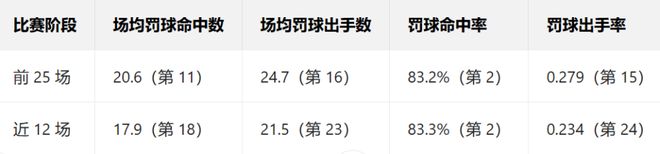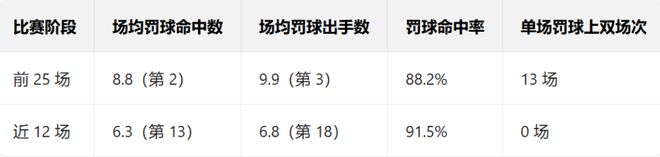 在这段低迷期,雷霆队场均罚球得分减少了近3分。值得注意的是,全队本赛季唯一一位场均罚球出手超过3.8次的球员——亚历山大,几乎包揽了这份数据下滑的全部原因。 以下是亚历山大的个人罚球数据(括号内为联盟排名)——