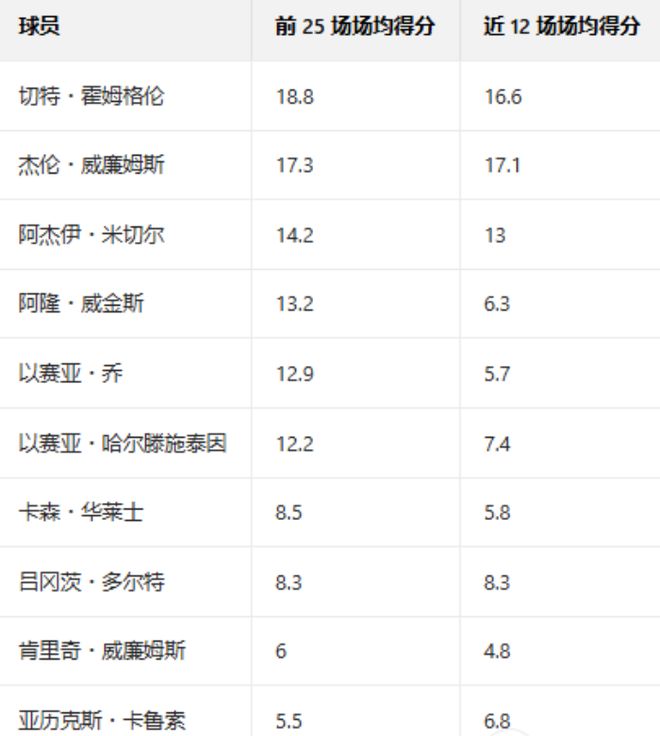 当亚历山大在场的1191分钟里,雷霆队的进攻效率高达122.1;而在他不在场的605分钟里,球队的进攻效率骤降至108.8。 本赛季雷霆队队内,除亚历山大外,再无其他球员场均得分达到20分。除了杰伦-威廉姆斯(休赛期接受手腕手术后,状态始终未能恢复至巅峰水准),其他角色球员均缺乏自主持球进攻的能力。一旦没有亚历山大的带动,雷霆队很难在阵地战中创造出有效的得分机会。 不过对雷霆来说,好消息是亚历山大近年来的表现堪称历史级稳定:自2024年10月30日以来,他已连续108场比赛得分不低于20分,这是NBA历史上第二长的纪录;自2022-23赛季他首次入选最佳阵容一阵以来,他也仅在10场比赛中得分未能突破20分。 自2023-24赛季雷霆队跻身争冠行列后,亚历山大在出战的187场比赛中,有126场得分达到30+,而当他砍下30+时,雷霆队的战绩为104胜22负。他在此期间仅缺席了14场比赛,绝大多数时候,亚历山大都能挺身而出,扛着球队前进。 但当他状态下滑时,雷霆队的战斗力便大打折扣,近期的表现就是最好的证明。周二不敌黄蜂队的比赛中,亚历山大21投7中仅得到21分,创下本赛季个人进攻表现最差纪录。事实上,他本赛季表现最糟糕的三场比赛,全都出现在过去两周—— 12月26日负于马刺:22分6篮板4助攻,19投7中,三分球6投1中 1月5日负于太阳:25分0篮板6助攻,22投8中,三分球5投1中 1月6日负于黄蜂:21分2篮板6助攻,21投7中,三分球5投1中 尽管在近12场比赛中,亚历山大依旧以52.2%的投篮命中率场均砍下29.5分,但当他需要队友支援时,身边人却未能及时站出来。除了多尔特和卡鲁索,其他所有轮换球员近12场的场均得分,都低于球队24胜1负开局阶段的表现。 以下是角色球员的场均得分变化——
