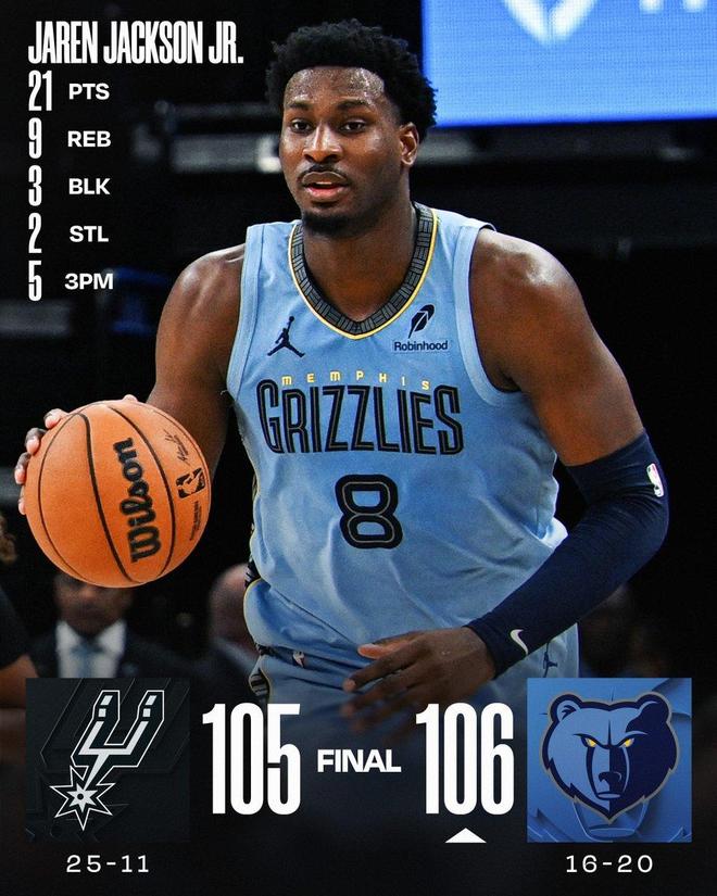 两队数据 灰熊队,小贾伦杰克逊16中7,三分球7中5砍下了21分9板2助2断3帽,在攻防两端发力。斯潘塞15中8高效的砍下了21分8板8助,末节独得13分2板1抢断成为取胜功臣。文斯威廉姆斯7中5,三分球6中4得到了15分6板5助,从替补席爆发。阿尔达马10中3,三分球6中1得到10分9板2助2帽、韦尔斯8分3板2助、波普8中3得到6分3板3助、科洛克4分6板1助3帽、GG·杰克逊6中1得到2分7板1助、斯莫尔1板2助。 灰熊爆冷逆转马刺