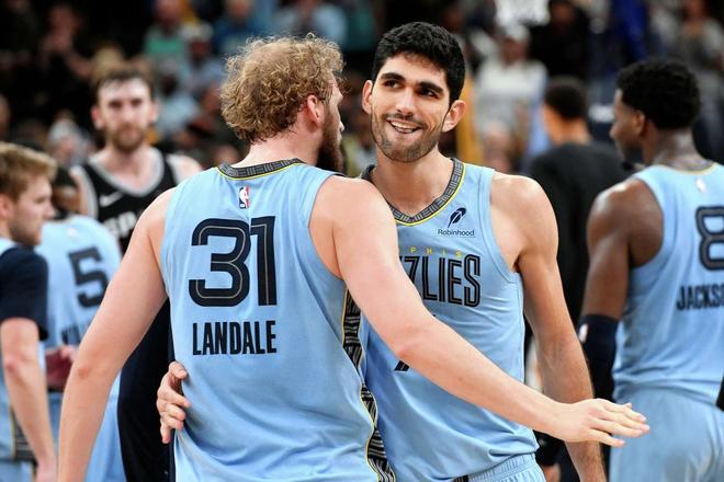 尽管末节福克斯连得7分,但是为时已晚。福克斯在决胜时刻中投不进,绝杀球也被封盖。此役,福克斯的正负值还是全队最低的-18。队内核心福克斯的彻底沉沦,是马刺惨遭爆冷逆转的主因。 火箭旧将暴走 灰熊队悍将乔克兰代尔,在此役强势暴走。兰代尔上场24分钟,15投8中,三分球7投3中,罚球2中0,得到了19分9板2助攻1盖帽的数据。作为火箭旧将,兰代尔在攻防两端都侵略性十足。兰代尔以53%的命中率轰下了全队的第二高分,还以43%的命中率投进了全队第3多的3分球。在进攻端爆发的兰代尔,还是此战的篮板王。同时,兰代尔的6个前场篮板冠绝全场。 兰代尔与阿尔达马在场上庆祝