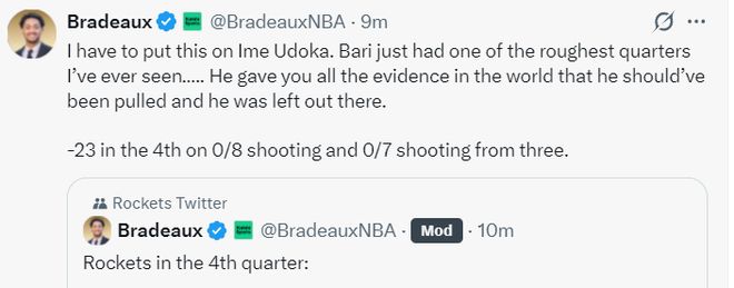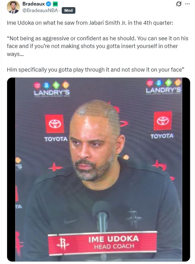 火箭记者Bradeaux:我认为小贾低迷的问题乌度卡也该担责,小贾正在经历我见过最艰难的时刻,他本该被弃用,但乌度卡依旧不换下他。