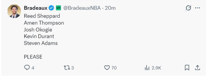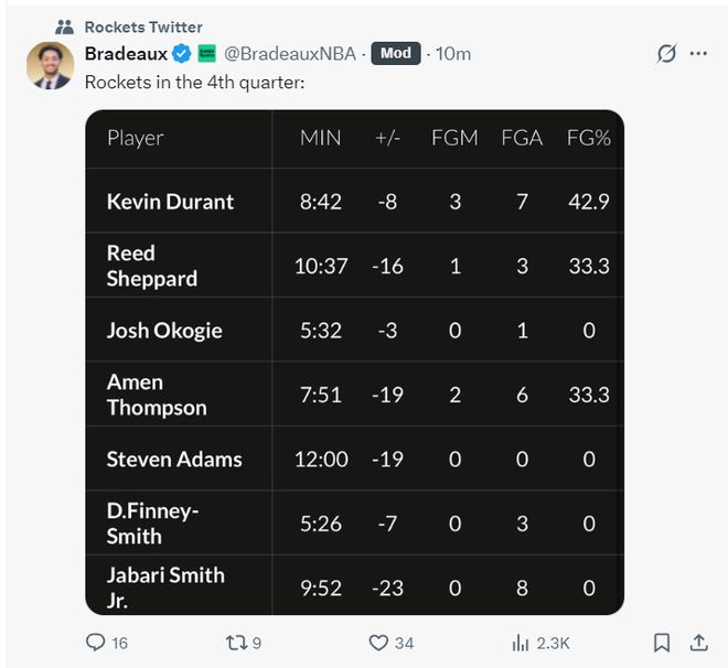火箭记者Bradeaux:决胜时刻火箭应该用谢泼德、阿门、奥科吉、杜兰特、亚当斯。 |