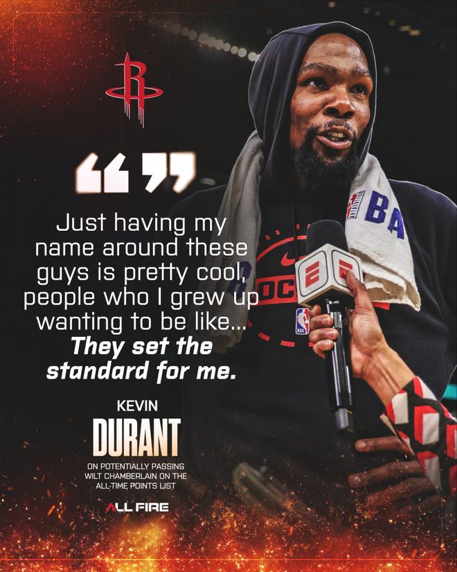 上个月,杜兰特成为联盟第八位生涯总得分突破31000分的球员,当时他坦言,能够与詹姆斯、贾巴尔、卡尔-马龙、科比、乔丹、诺维茨基和张伯伦这些名宿并肩,对他意义重大。 本场比赛的赛前,杜兰特被问到得分即将超越张伯伦的话题。他说道:“我刚接触篮球、学习打球的时候,张伯伦早就退役了。大家对他的印象,大多都来自那些数据,一串串冰冷的数字。” “从我还是个孩子起,就一直听着张伯伦的传奇故事,却从没看过他打球。可当你看到那些数据时,根本无法想象,有人能轰下50分、抢下25个篮板,得分如探囊取物,篮板、封盖无所不能。”