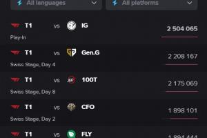 S15世界赛海外收视峰值前五名:T1目前五场比赛占据热度前五