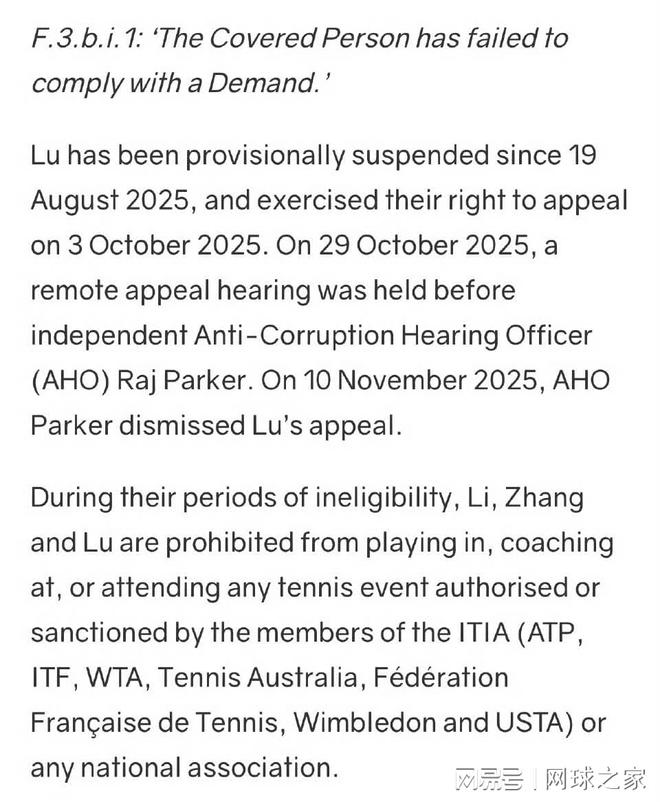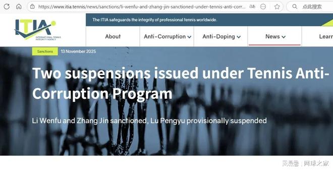 情况如下:国际网球诚信机构(ITIA)近日公布对中国网球选手李文夫、张瑾和陆鹏宇的处罚决定,两位“00后”小将因操纵比赛牟利遭禁赛,另一人因违反反腐败规定被临时停赛且上诉被驳回,具体禁赛时间还需要国际反腐败机构的进一步考虑和裁定。 这一发生在中国网球运动蓬勃发展时期的年轻选手集体违规事件,为整个行业敲响了警钟。 ITIA的处罚公告显示,21岁的李文夫与张瑾在2024年的调查中坦言,为获取报酬参与了比赛操纵。由于二人未对ITIA的指控作出回应,也未行使上诉权利,相关制裁已正式生效。