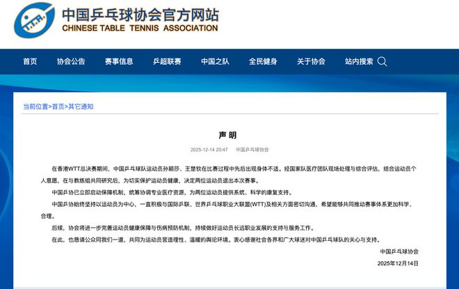 12月14日,中国乒乓球协会发布声明,全文如下: