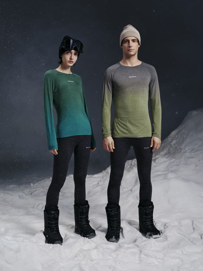 相比瞬时排湿,身体更需要的是一种低负担、可持续的舒适感。正是在这样的体感需求下,零压羊毛成为贴身层中不可或缺的选择。它具备出色的快干表现,同时以更柔软、亲肤、低束缚的穿着特性,减少长时间滑雪中的紧绷与疲惫感,让贴身层以一种近乎无感的方式与身体保持接触。这种舒适而放松的体感,也让零压羊毛自然适配于运动与日常之间的多种使用场景。