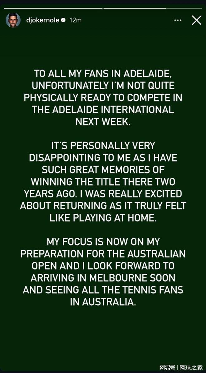 “很遗憾,我的身体状态尚未准备好参加下周的阿德莱德国际赛。 这对我个人而言非常令人失望,因为我对两年前在那里夺冠的经历仍记忆犹新。我原本对重返赛场满怀期待,那里于我而言就像主场一样。 如今我的重心已放在澳网的备战上,我期待很快抵达墨尔本,与澳大利亚所有的网球迷相见。”德约科维奇在声明中坦率地表达了身体状态未达最佳的事实。 字里行间透露出这位网坛传奇复杂的心绪,既有对无法参赛的遗憾,也有对过往荣耀的珍视,更有对澳大利亚这片土地的深厚情感。