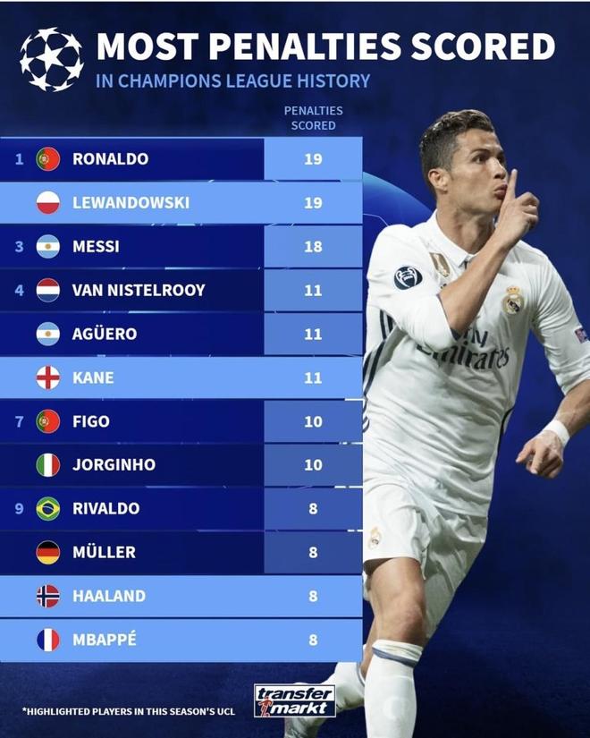 欧冠点球真相:德转发布欧冠点球排名!C罗点球数最多但占比最低