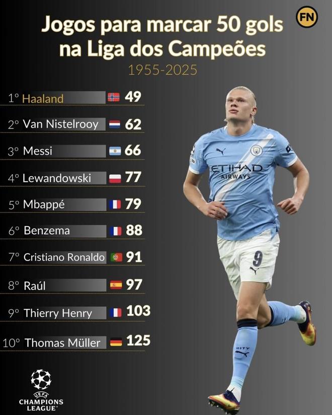 最快达成欧冠50球所用场次排名!梅西66场哈兰德比梅西少用17场