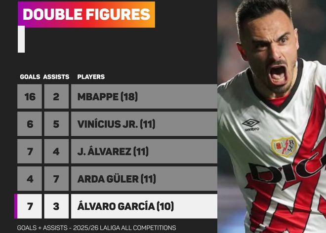 阿尔瓦罗加西亚是本赛季五大联赛首位制造进球上双的西班牙球员