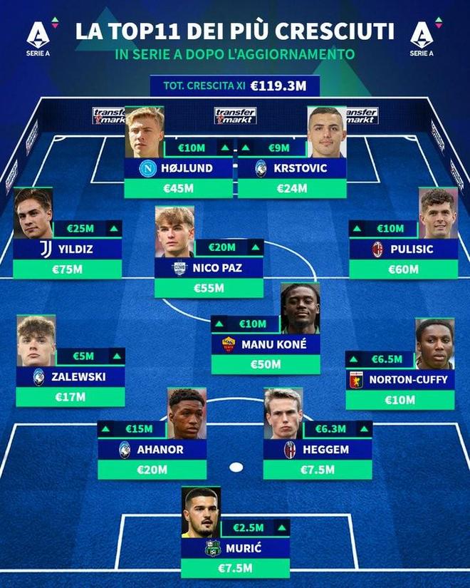 意甲身价涨幅最高11人阵容:霍伊伦、伊尔迪兹、普利希奇领衔