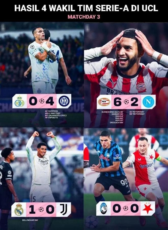 今天凌晨,本周各层级欧战全部结束!我们盘点一下意甲欧战球队的战绩发现,7支球队只取得了3胜1平3负的战绩,而在4支欧冠球队中更是只有国米一队获胜,博洛尼亚和佛罗伦萨也分别在欧联、欧协联赛事中赢球。 尤文客场0:1小负皇马已经算是不错的结果,可那不勒斯2:6惨败荷甲埃因霍温,亚特兰大主场0:0被捷克球队布拉格斯拉维亚逼平实在是令人难以接受!征战欧联杯的罗马同样爆冷,主场1:2不敌弱旅比尔森胜利,巧合的是这支球队同样来自捷克联赛。两支意甲球队主场面对两支捷甲弱旅却打出了一平一负的战绩,匪夷所思!
