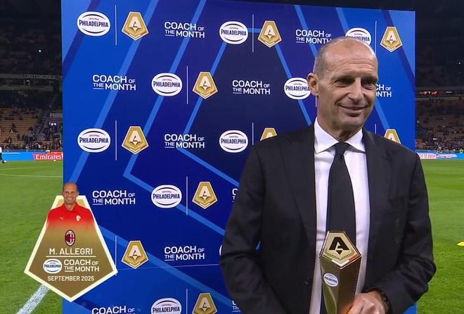 荣耀时刻,阿莱格里领取意甲9月最佳教练奖