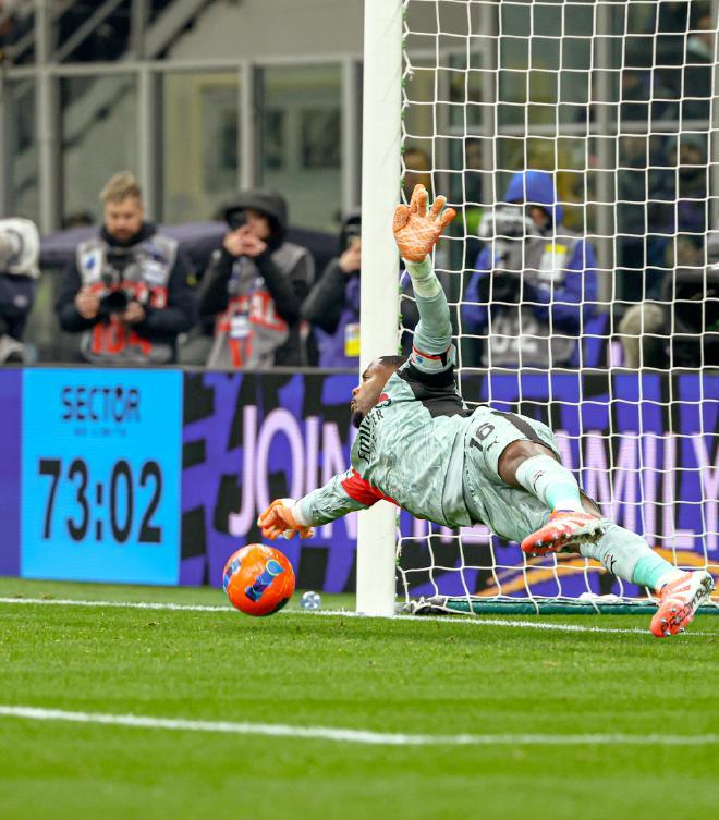 随着主裁判一声哨响,国际米兰就在主场球迷的助威声中,朝着同城死敌的球门发起了猛攻,第4分钟迪马尔科左路下底传中,小图拉姆禁区内俯身冲顶头球,被迈尼昂神扑化解,第15分钟国米右侧角球开出,苏契奇大禁区前沿抢到第二点直接大力轰门,可惜没有压住皮球直接飞出底线。 第28分钟国际米兰差点打破场上平衡,阿切尔比接到队友开出的左侧角球后,前点甩头攻门,可惜运气不佳,皮球击中立柱被弹出,7分钟之后,劳塔罗禁区内不停手抽射,被迈尼昂扑了一下后,又一次打在立柱上,靠着门框的帮忙,AC米兰带着0-0的比分,回到了中场更衣室。