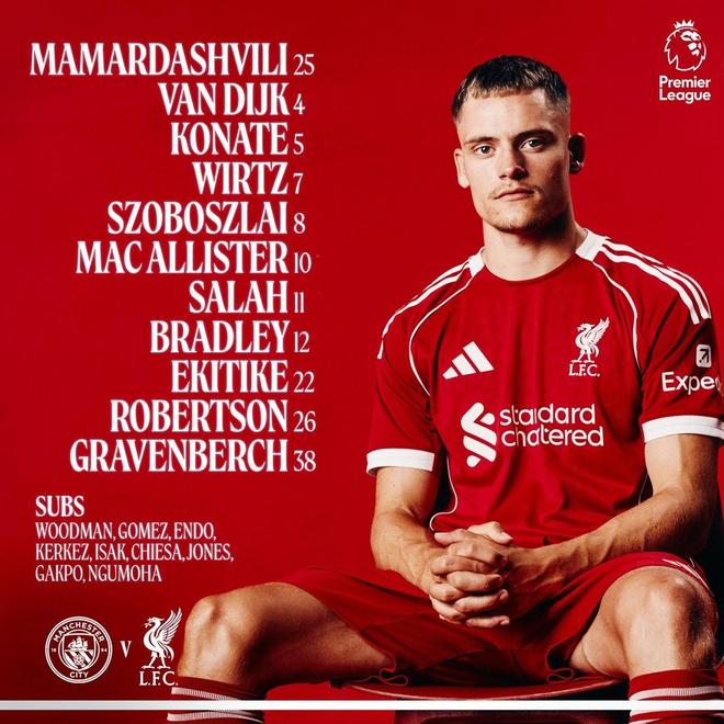 曼城首发:25-多纳鲁马、27-马特乌斯-努内斯、3-鲁本-迪亚斯、24-格瓦迪奥尔、33-尼科-奥赖利、14-尼科-冈萨雷斯、47-福登、20-伯纳多-席尔瓦、10-谢尔基、11-多库、9-哈兰德 替补:1-特拉福德、4-赖因德斯、5-斯通斯、6-阿克、7-马尔穆什、21-艾特-努里、26-萨维尼奥、52-奥斯卡-鲍勃、82-里科-刘易斯 利物浦首发:25-马马尔达什维利、26-罗伯逊、4-范戴克、5-科纳特、12-康纳-布拉德利、10-麦卡利斯特、38-赫拉芬贝赫、8-索博斯洛伊、11-萨拉赫、7-维尔茨、22-埃基蒂克 替补:28-伍德曼、2-乔-戈麦斯、3-远藤航、6-凯尔凯兹、9-伊萨克、14-费代里科-基耶萨、17-柯蒂斯-琼斯、18-加克波、73-恩古莫哈