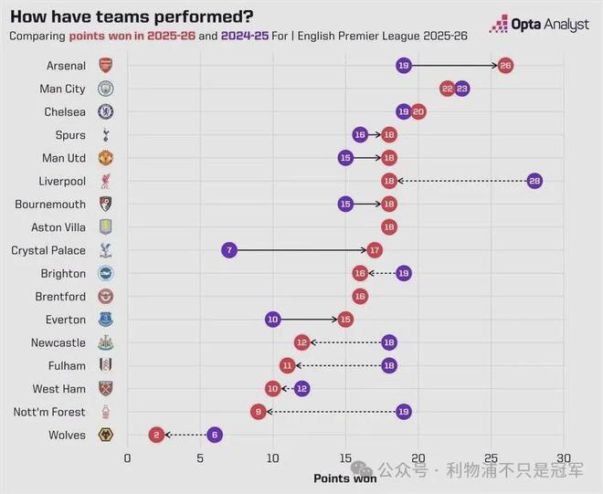 此外,本赛季前11轮英超各队的积分与上赛季同期相比,利物浦少了10分(本赛季18分,上赛季28分),与诺丁汉森林(本赛季9分,上赛季19分)并列退步最大球队。两支球队本周末“菜鸡互啄”直接对决! 而阿森纳比上赛季同期多7分,是进步第二大的球队,第一是利物浦苦主水晶宫,比上赛季同期多拿10分。