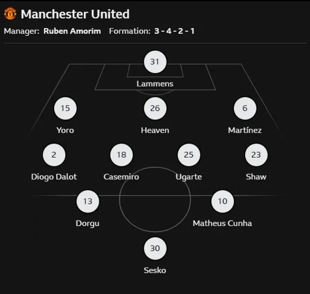布鲁诺·费尔南德斯、梅森·芒特、科比·梅诺、德里赫特和马奎尔继续伤缺,姆贝莫、阿马德·迪亚洛和马兹拉维还在踢非洲国家杯,鲁本·阿莫林恢复了自己心爱的343阵型,并且选择了多达9名倾向于防守的球员,试图以稳为主。