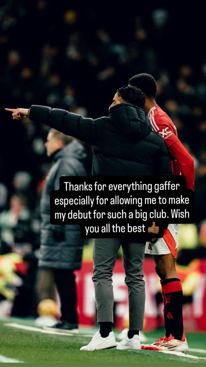 在阿莫林下课后,曼联18岁前锋奥比-马丁在社交媒体告别阿莫林并致谢。