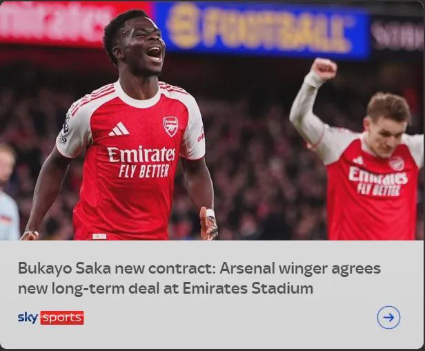 罗马诺发推:萨卡已经和阿森纳就一份2031年到期的5年合同达成了协议。续约已经达成口头协议几个月时间,而现终于得到了阿森纳法务部门的批准,很快就会官方确认。 另外根据gunnerblog的消息,阿森纳即将和赖斯以及哈弗茨展开续约谈判。 赖斯、哈弗茨包括廷贝尔,他们的续约以后再说,问题也不大(当然哈弗茨其实未来没那么明朗),先说萨卡。