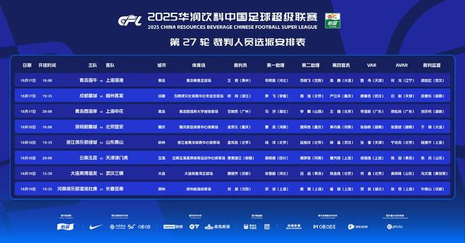 北京时间10月17日,中国足协官方公布了中超第27轮裁判选派安排表。