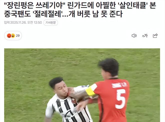 文章最后一段写道,刚实现中超三连冠的上海海港(目前亚冠仅积1分)在亚冠精英赛中却遭遇三连败,跌至12支参赛球队的垫底位置,赛后,球队竟在主场球迷面前举行了中超夺冠的庆祝仪式,引发球迷强烈不满,纷纷指责球员“输成这样还笑得出来?脸呢!” 另一韩媒发文标题大意是:林加德梅开二度却遭凶铲+面部暴力,上海再演惹怒功夫足球(下图)。文章批评张琳芃的危险凶铲有可能导致林加德受伤。