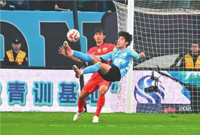 图③:英博海发队球员朱鹏宇(前)倒钩射门。 本报记者 孙海涛 摄