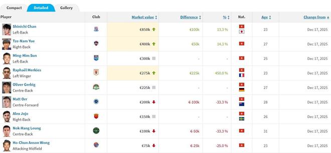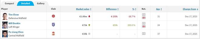 北京时间12月17日,转会市场网公布了中超联赛球员的最新身价,在港台球员中,效力成都蓉城的周定洋以100万欧元身价居首。